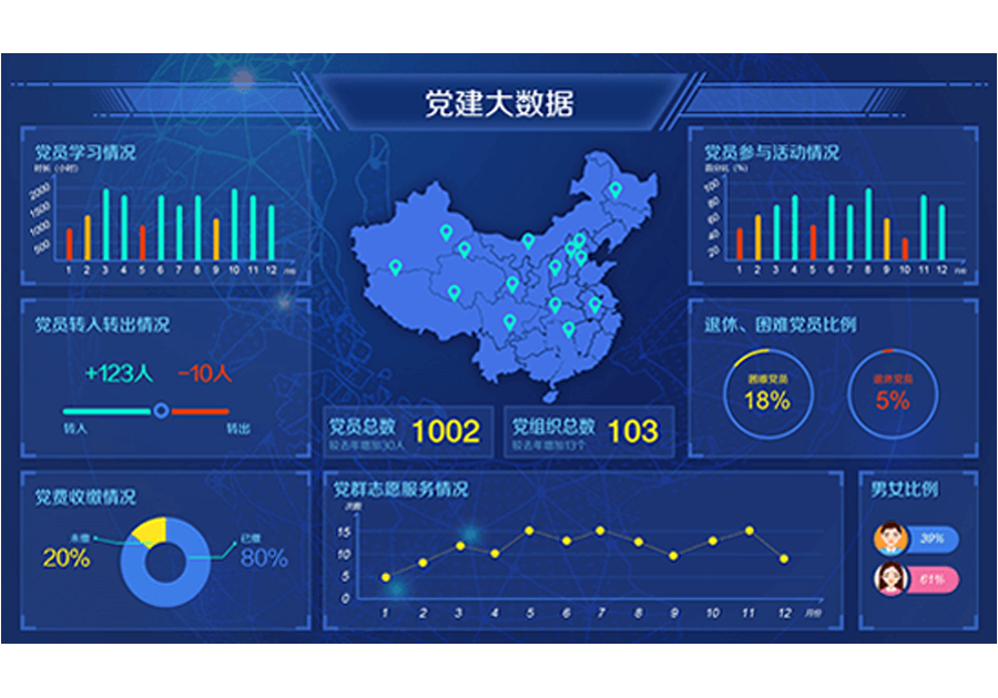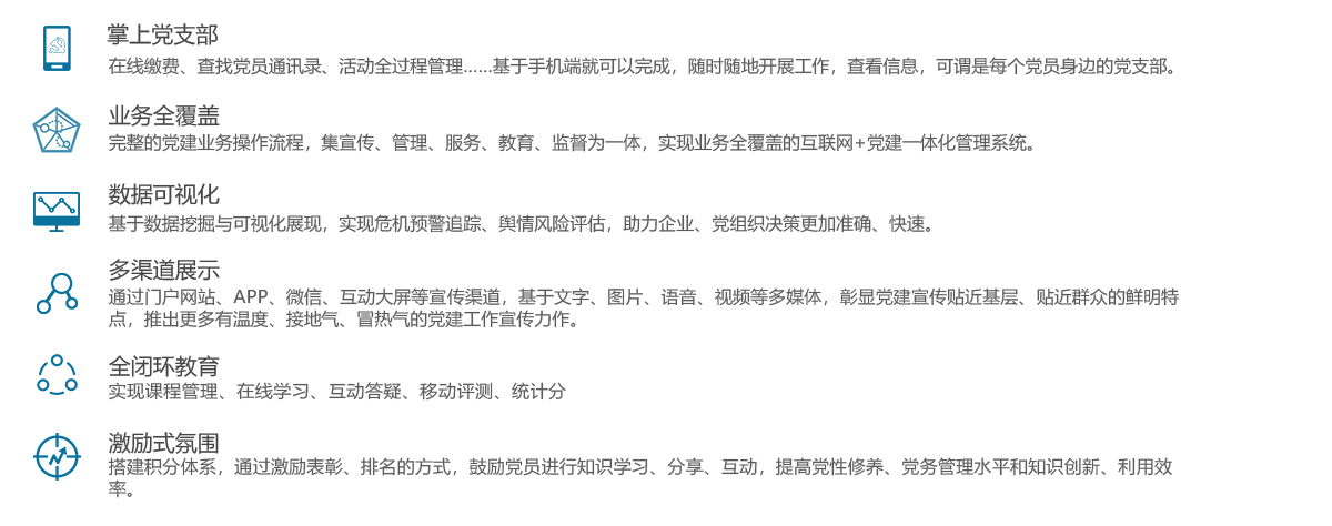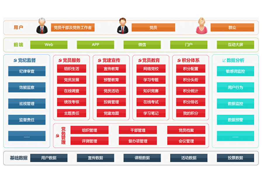 以党的十九大指出的“新时代党的建设总要求”为指引,结合当前党建工作现状,运用互联网、云计算、大数据等信息化技术,所打造的集党的“政治建设、思想建设、组织建设、作风建设、纪律建设、制度建设”于一体的综合性党建工作平台。通过党务管理、发展党员、三会一课、在线学习、党员管理、任务管理、督查督办、大数据分析等功能模块的应用,全面实现党建工作的规范化、制度化、长效化、智能化。为基层党组织提供标准的工作平台、为上级党组织提供建设工作监管平台,助力用户将党建设好、建设强。